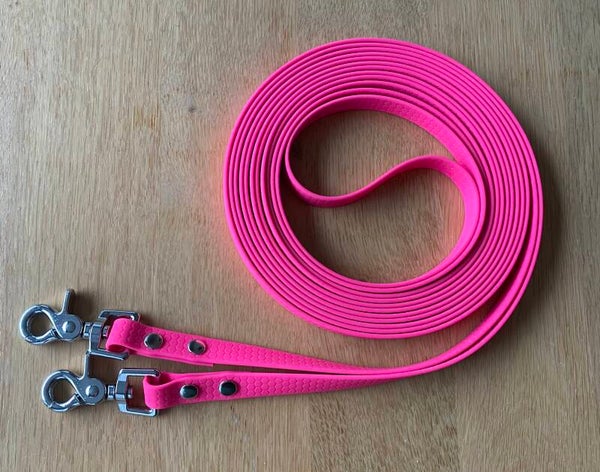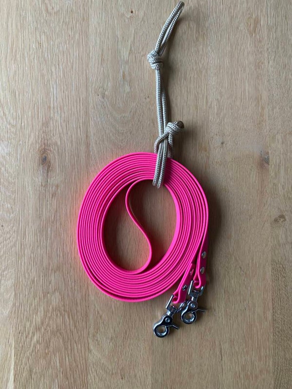 Uit voorraad leverbaar. Deze super fijn in de hand liggende leidsels/ menteugels van hexa grip. Het hexa grip is 16mm breed. Lengte = 6m. Breedte hexa grip = 16mm. Kleur = fel roze.